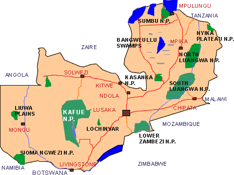 Départ de Victoria Falls et route pour le Parc National de Kafue.18 et 19 Juin 2001 : Sud de Kafue national park
