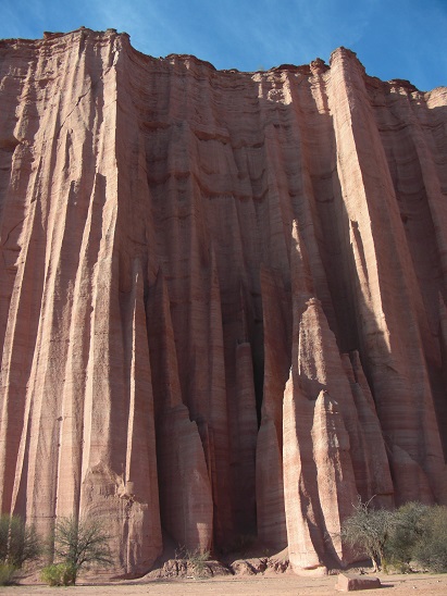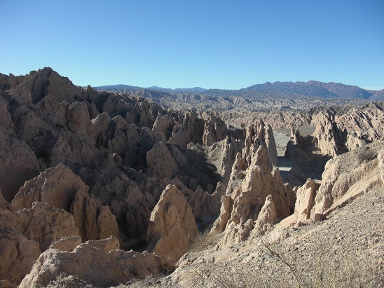 Puis on traverse l'étonnante Quebrada de las Flechas. La Quebrada de la Flechas, si elle n'est pas la plus connue des "quebradas" de la région de Salta, est probablement l'une des plus spectaculaires. Quasiment complètement désertique, elle offre des reliefs érosifs uniques, en forme de flèches pointées vers le ciel. Ce paysage est le résultat de l'action du vent sur des dépôts d'un ancien fleuve. La piste traverse en zig-zag cette étonnante forêt de roches.
