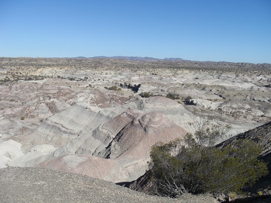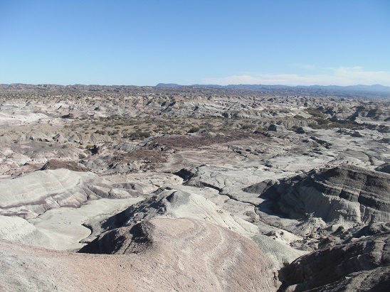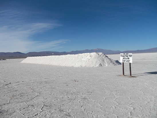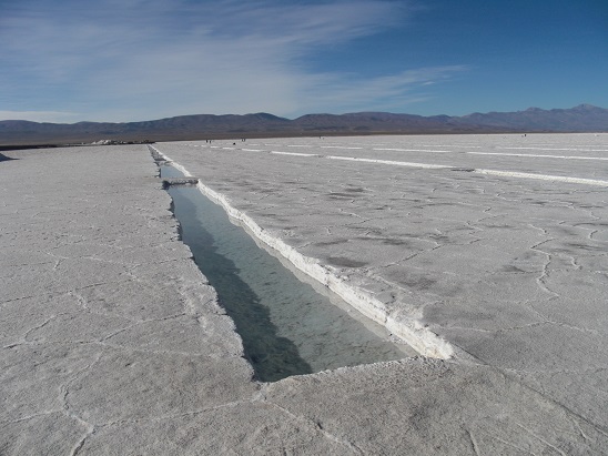 A notre arrivée sur l'altiplano, c'est un spectacle étincelant qui s'offre à nous : les Salinas Grandes. Salinas Grandes est un salar, c'est à dire une étendue, immense (12 000 hectares), de sédiments salins. L'origine du salar est due au retrait d'un lac immense par évaporation. Ses sédiments issus du lessivage des volcans alentour sont composés de chlorures de sodium, de potassium, de nitrates et autre borate. Ce sont ces sels qui composent aujourd'hui le salar, sels qui sont exploités et comestibles, après traitement et ajout d'iode. Le blanc immaculé de ce désert de sel est impressionnant. Sa platitude tranche avec les reliefs des sommets andins. De magnifiques figures de dessiccation se dessinent à sa surface, formant des polygones à la géométrie quasi parfaite.