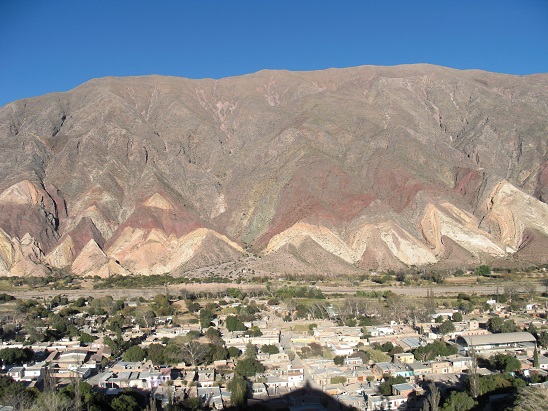 Descente plein sud jusqu'à Purmamarca, dernier village sur la route inter-andine qui mène au Chili par-delà un col à 4700m ! Randonnée à la Montagne aux 7 couleurs qui toise Purmamarca. Cette curiosité géologique, dont les tonalités ocre et pastel se détachent sur le ciel bleu, a été formée par l'empilement de sédiments marins, lacustres et fluviatiles. Excavés par l'érosion puis surélevés et torsadés par des mouvements tectoniques, l'ensemble forme désormais des vagues de couches de couleurs différentes, pictées de quelques buissons verdâtres.