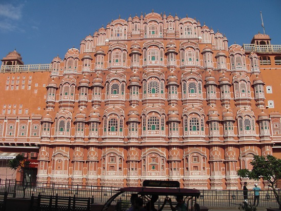 Coup d'oeil à cet intrigant paravent aux chimères qu'est le Hawa Mahal, le palais des Vents. Édifié en 1799, le Hawa Mahal n'est qu'un décor de théâtre, une élégante façade rose rythmée de loges saillantes, dont les longs couloirs et escaliers rétrécissent à mesure qu'on approche du sommet : les dames de la ville, derrière sa façade ajourée, assistaient sans être vues aux fêtes de la ville.