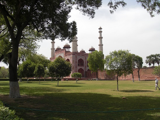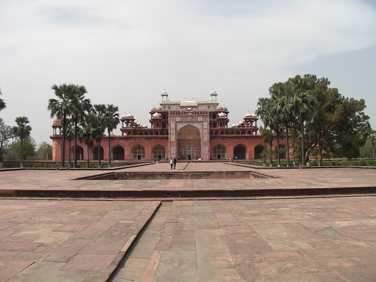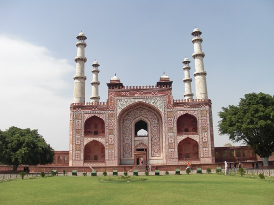 Le plus grand empereur moghol en entreprit la construction lui-même, mêlant motifs et styles islamiques, hindou, bouddhique, jaïn et chrétien, dans la lignée d'une religion syncrétique qu'il développa : le Deen Ilahi. À sa mort, le mausolée fut achevé par son fils Jehangir, qui en modifia considérablement les plans tout en gardant les symboles syncrétiques chers à son père.