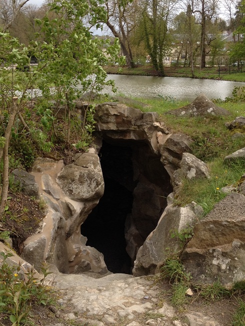 La grotte: "Cette cascade est très en vue, mais ce qui ne l'est pas de même est une grotte à côté de son bassin de laquelle l'entrée est difficile, mais qu'on trouve au dedans assez espacée, éclairée par une fenêtre naturelle, ceintrée en tiers-point, et décorée d'un ordre d'architecture qui n'est ni Toscan ni Dorique, mais l'ordre de la nature qui sait mettre des proportions et de l'harmonie dans ses ouvrages les moins réguliers."
