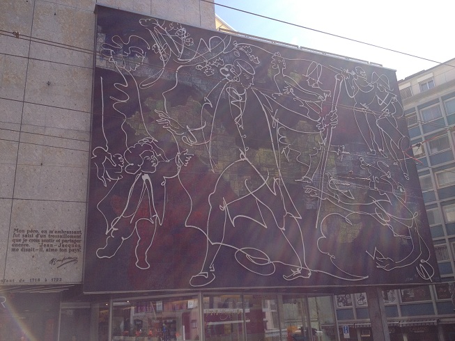 Rue de Coutance 26: à 6 ans Rousseau y habite avec son père et son frêre. La fresque de Hans Herni illustre la fête à Saint-Gervais et les propos de son père. "Mon père, en m'embrassant, fut saisi d' un tressaillement que je crois sentir et partager encore. Jean-Jacques, me disait-il, aime ton pays."