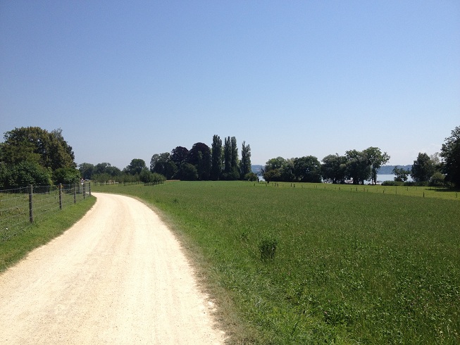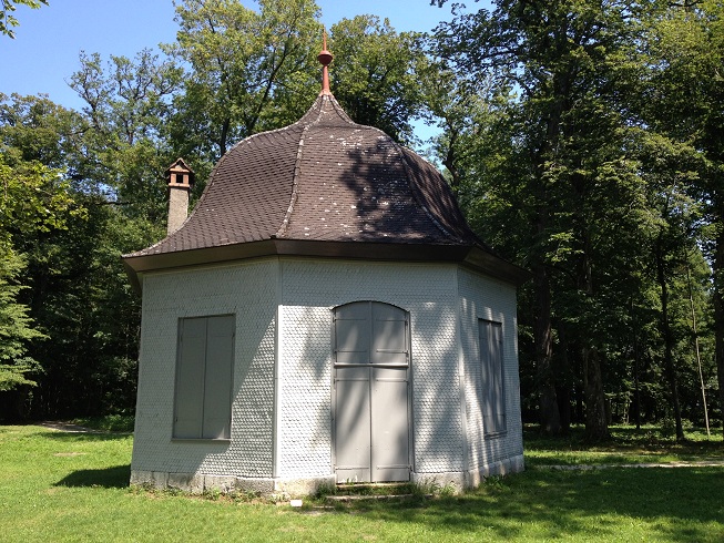 Le pavillon. "On y trouve des champs, des vignes, des bois, des vergers, de gras pâturages ombragés de bosquets et bordés d'arbrisseaux de toute espéce dont le bord des eaux entretient la fraîcheur; une haute terrasse plantée de deux rangs d'arbres borde l'Isle dans sa longueur, et dans le milieu de cette terrasse on a bâti un joli salon où les habitans des rives voisines se rassemblent et viennent danser les dimanches durant les vendanges.".