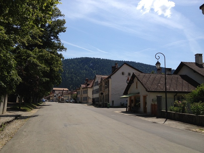 Grand Rue à Motiers. La maison de Rousseau se trouve dans la rue Jean-Jacques Rousseau, à droite au niveau de la fontaine.
