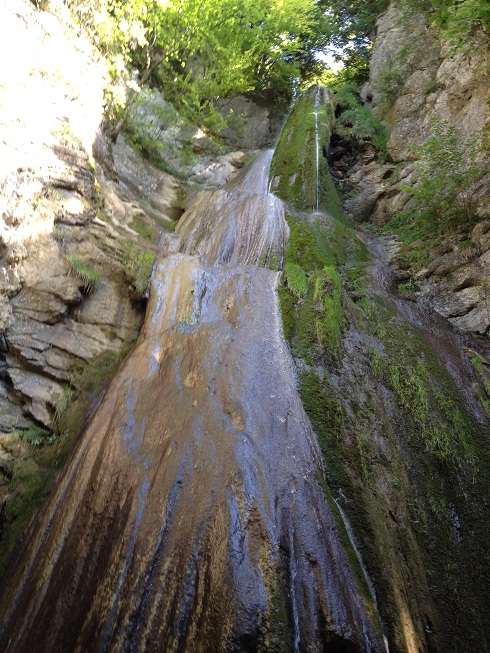 La cascade: "J'ai vis-à-vis de mes fenêtres une superbe cascade qui du haut de la montagne tombe par l'escarpement d'un rocher dans le vallon, avec un bruit qui se fait entendre au loin, surtout quand les eaux sont grandes."