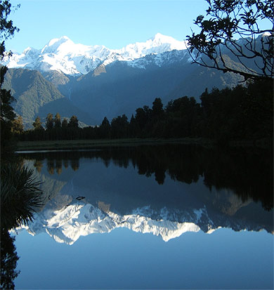 Sans doute la plus belle route du pays ! Le matin, balade au bord du magnifique lac Matheson qui reflète dans ses eaux paisibles le mont Cook, le plus haut sommet de Nouvelle-Zélande.