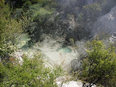 Route vers Taupo. En chemin visite du site géothermique des "eaux sacrées" de Wai o Tapu, renommé pour ses bains bouillonnants, son geyser et sa palette de couleurs fascinante !